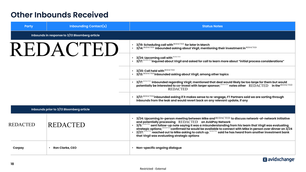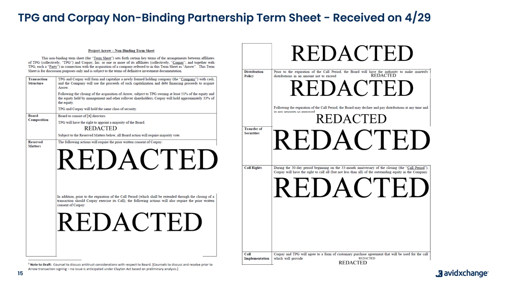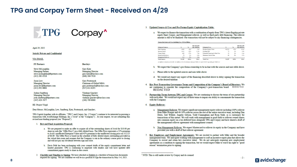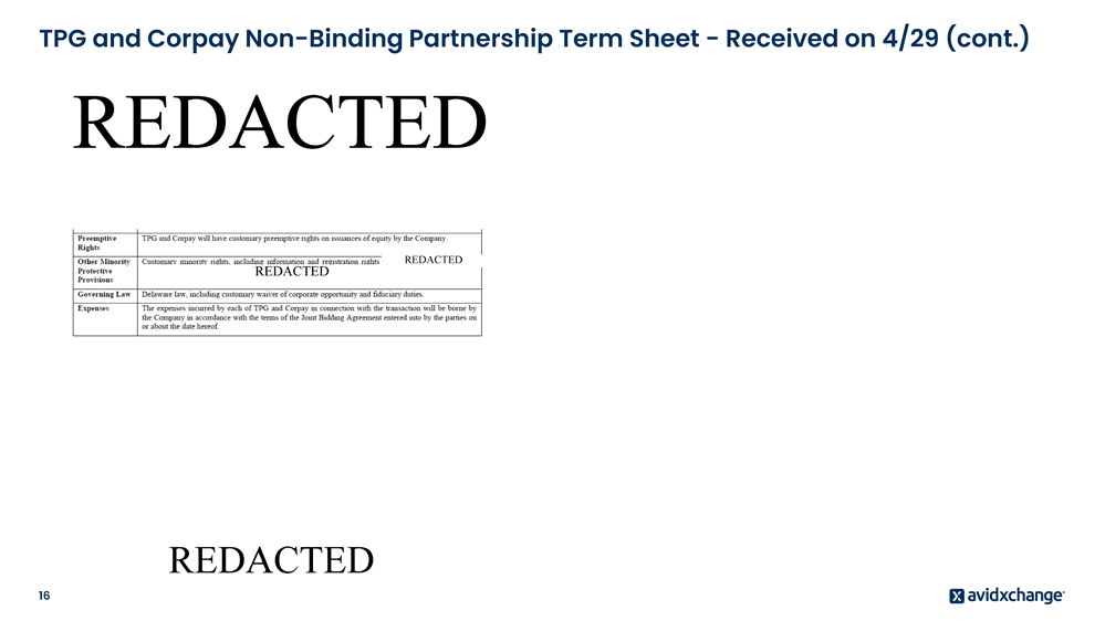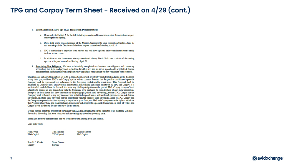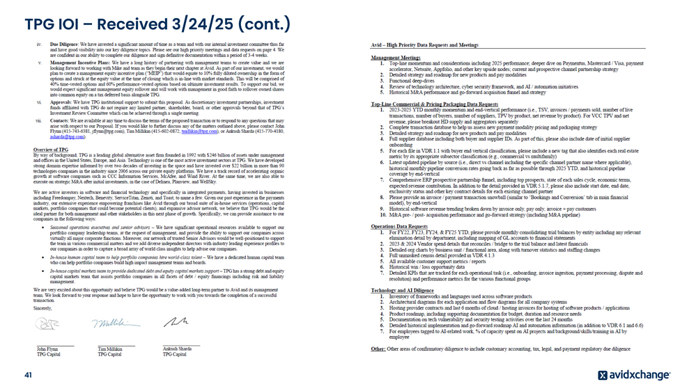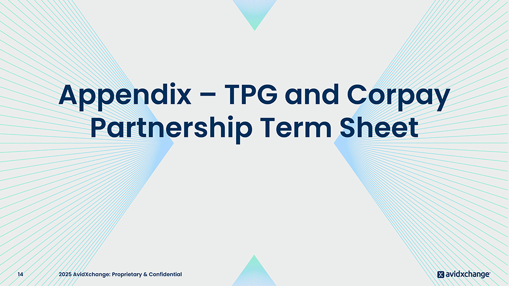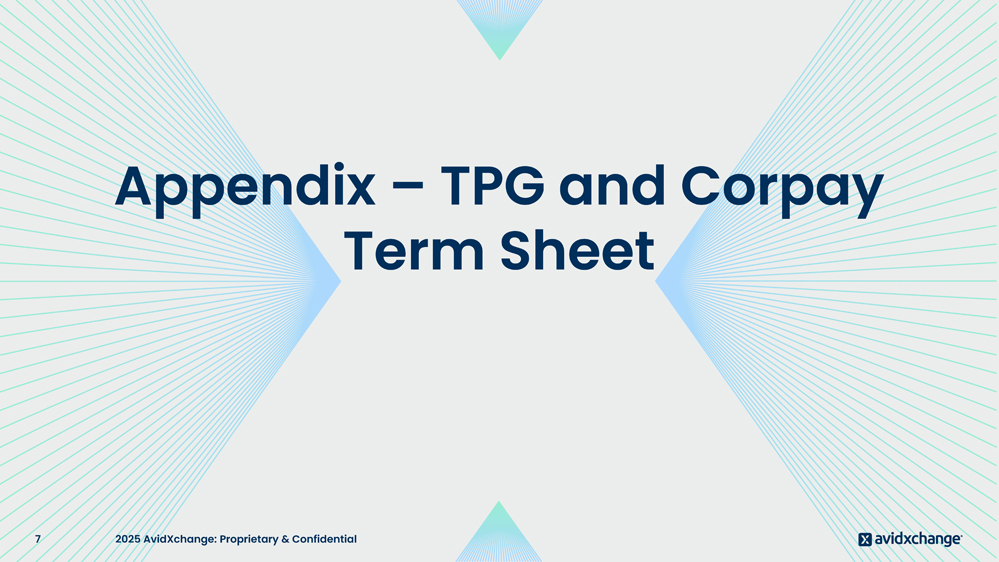 AvidXchange Holdings, Inc. Michael Praeger Green and Gold 2014 GRAT Green and Gold 2015 GRAT c/o AvidXchange Holdings, Inc. Michael Praeger Chief Executive Officer 1210 AvidXchange Lane Charlotte, NC 28206 (800) 560-9305 | Arrow Borrower 2025, Inc. Arrow Merger Sub 2025, Inc. Arrow Intermediate 2025, Inc. Arrow Holdings 2025, Inc. Arrow Parent 2025, L.P. Arrow Parent GenPar 2025, LLC TPG IX Arrow Parent Holdings, L.P. Arrow Parent Holdings GenPar 2025, LLC The Arrow Holdings Business Trust TPG Partners IX, L.P. c/o TPG Partners IX, L.P. 301 Commerce Street, Suite 3300 Fort Worth, TX 76102 (817) 871-4000 | Corpay, Inc. Alissa Vickery Chief Financial Officer 3280 Peachtree Road, Suite 2400 Atlanta, GA 30305 (770) 449-0479 | ||||