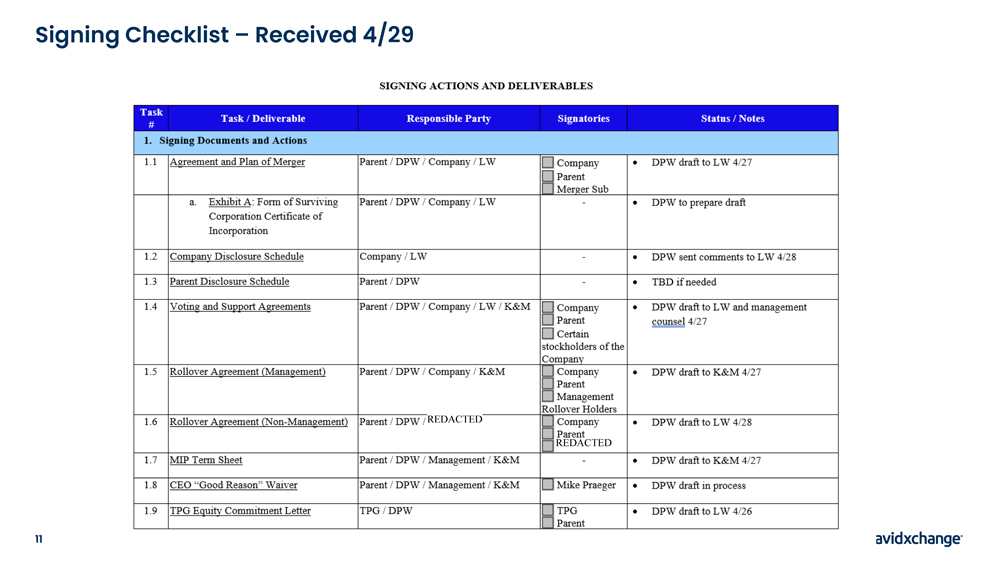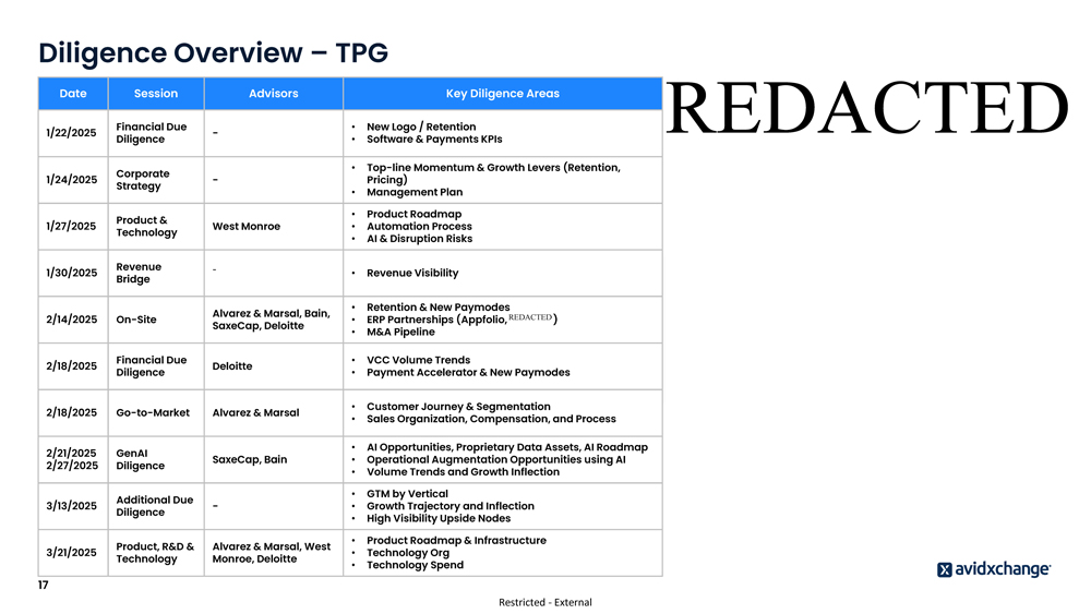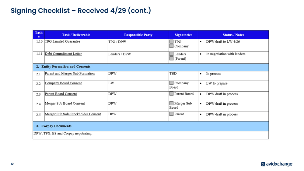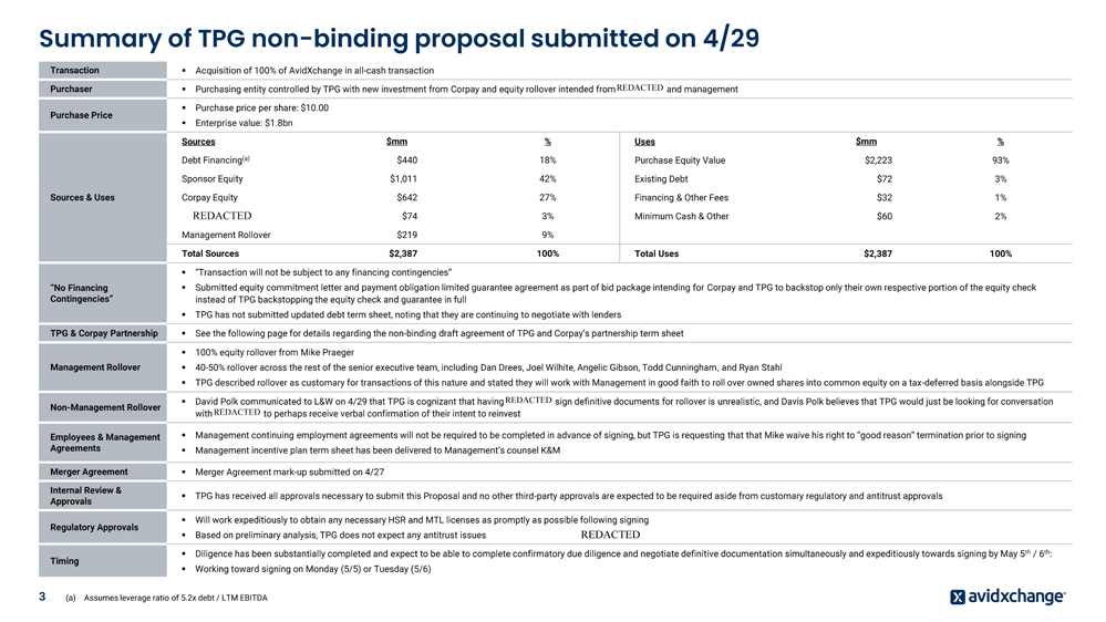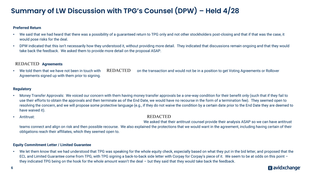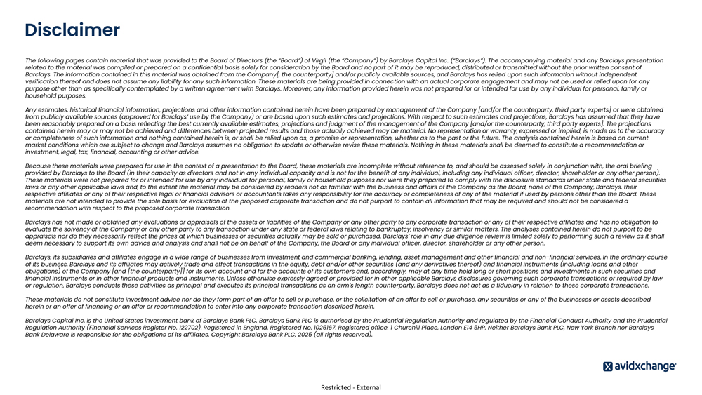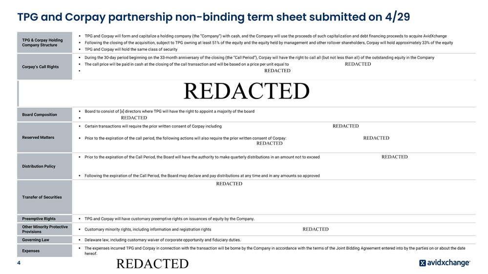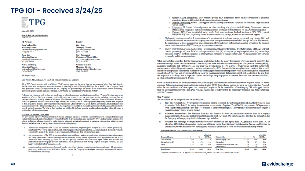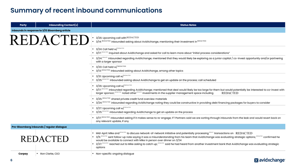 AvidXchange Holdings, Inc. Michael Praeger Green and Gold 2014 GRAT Green and Gold 2015 GRAT c/o AvidXchange Holdings, Inc. Michael Praeger Chief Executive Officer 1210 AvidXchange Lane Charlotte, NC 28206 (800) 560-9305 | Arrow Borrower 2025, Inc. Arrow Merger Sub 2025, Inc. Arrow Intermediate 2025, Inc. Arrow Holdings 2025, Inc. Arrow Parent 2025, L.P. Arrow Parent GenPar 2025, LLC TPG IX Arrow Parent Holdings, L.P. Arrow Parent Holdings GenPar 2025, LLC The Arrow Holdings Business Trust TPG Partners IX, L.P. c/o TPG Partners IX, L.P. 301 Commerce Street, Suite 3300 Fort Worth, TX 76102 (817) 871-4000 | Corpay, Inc. Alissa Vickery Chief Financial Officer 3280 Peachtree Road, Suite 2400 Atlanta, GA 30305 (770) 449-0479 | ||||